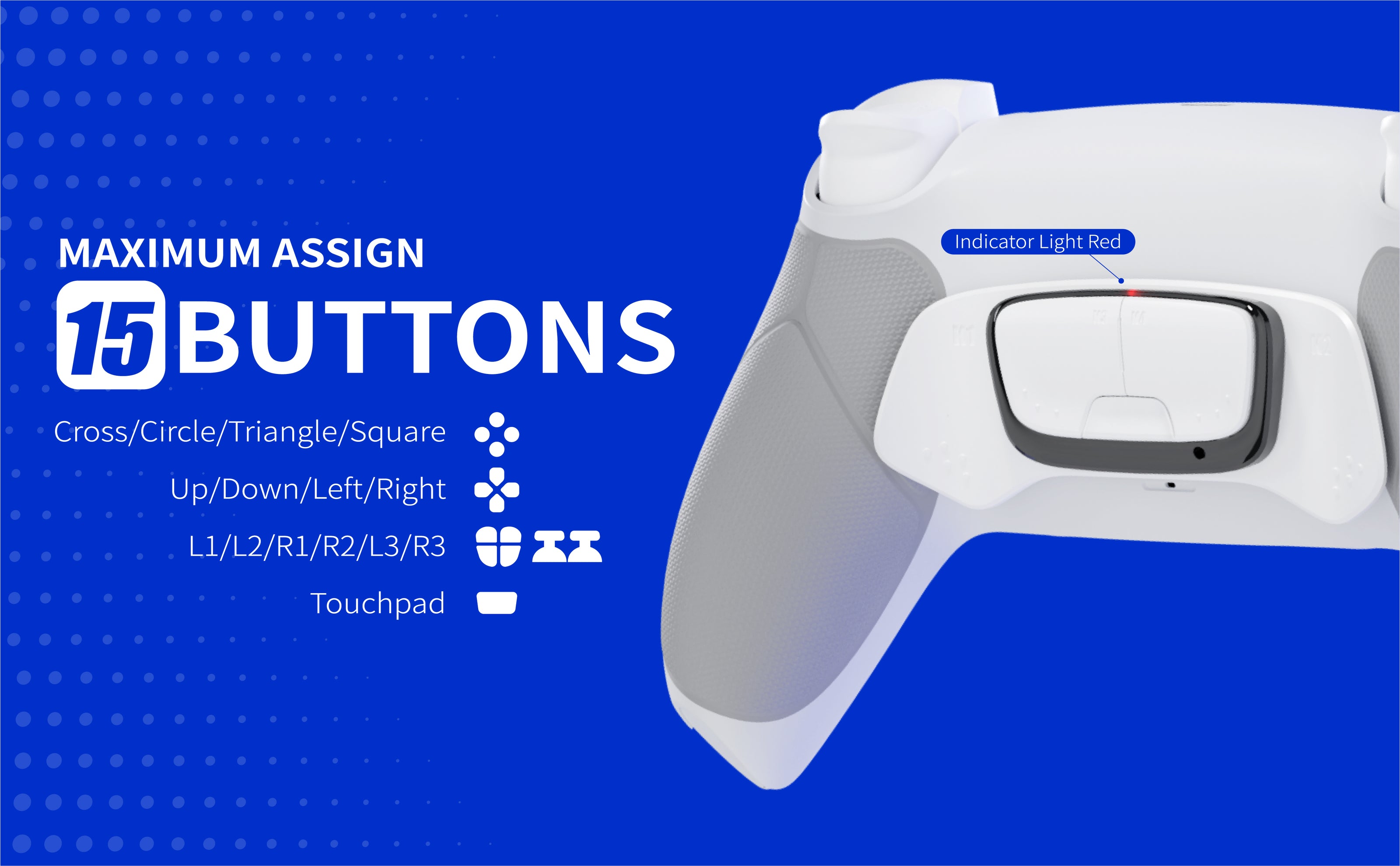 - You can activate the remap program during the game and assign maximum 15 buttons (X, O, Triangle, Square, Up, Down, Left, Right, L1, L2, R1, R2, L3, R3, Touchpad) to the rear buttons. Rubberized handles can enhance hand feeling and get a better grip to your controller.