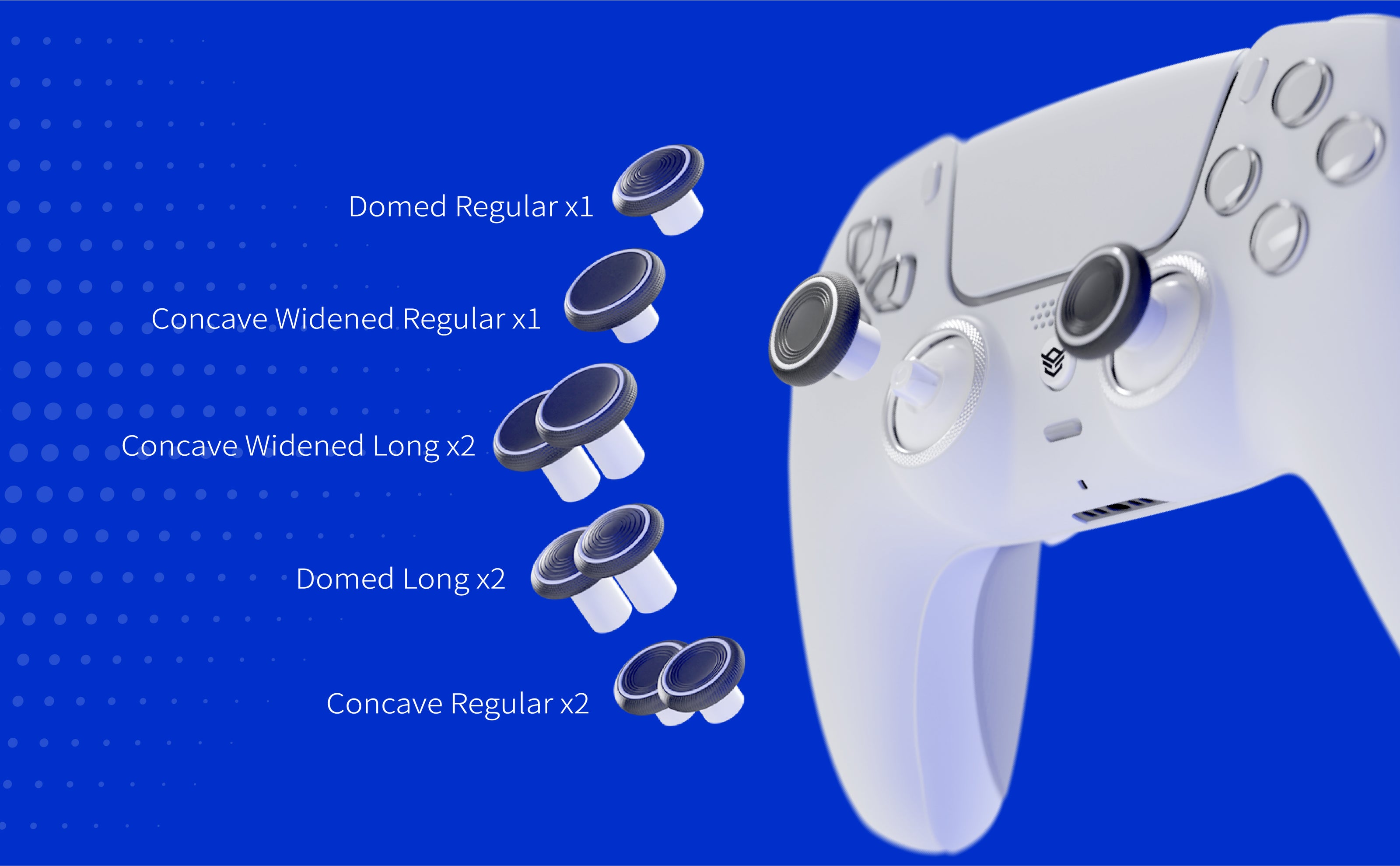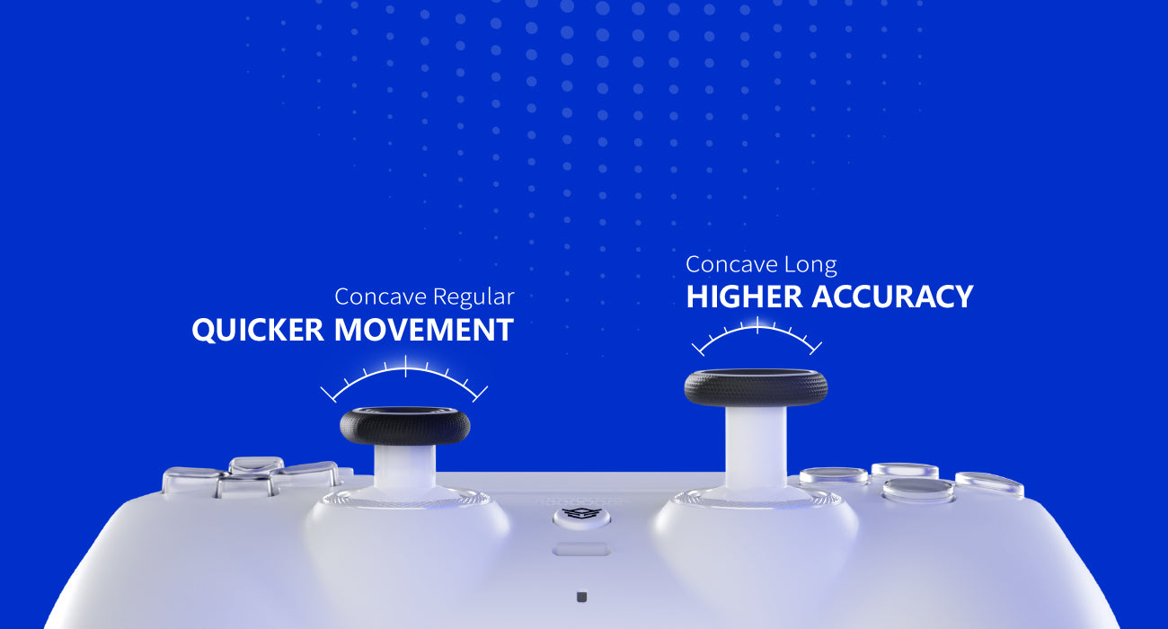 - Interchangeable textured thumbsticks, 2 different heights, 3 different ergonomic thumb grip designs, domed, concave, and concave widened. You can operate the controller flexibly, capture targets faster, and improve accuracy.