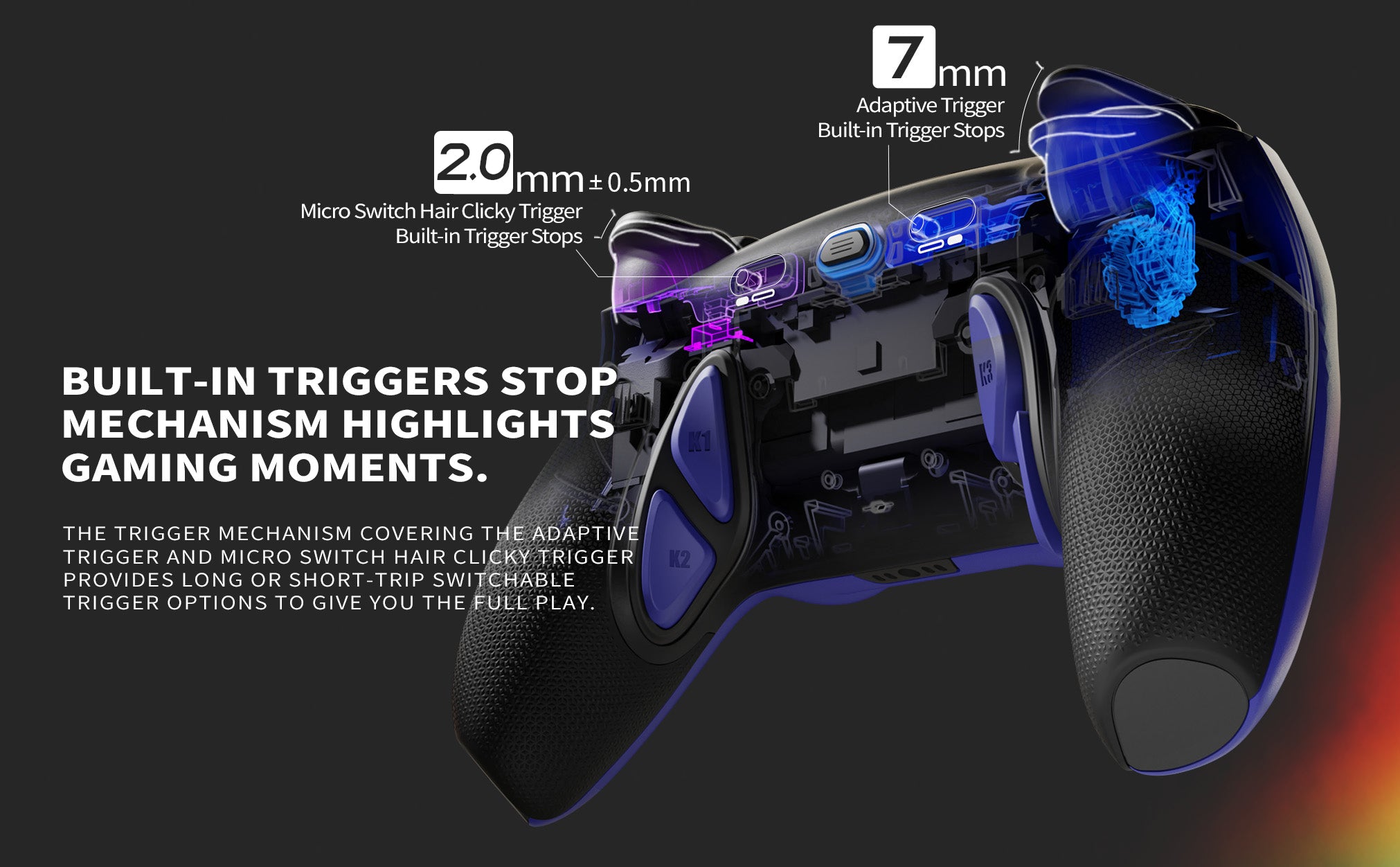 Perfect Your Trigger Pulls — Instantly toggle between adaptive and digital triggers with convenient trigger-mode switches. 1.5–2mm short-trip digital triggers, ideal for your favorite FPS games, give you mouse click trigger action. Meanwhile, adaptive triggers give you precise control, perfect for managing your throttle in racing games.