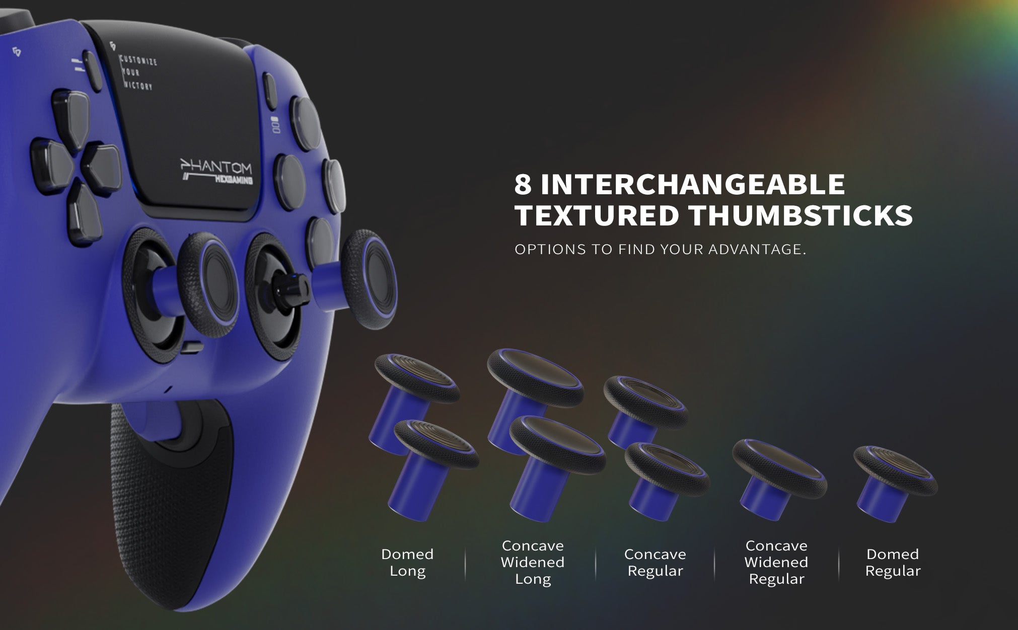 Get Ideal Stick Grip — Modify your thumbsticks to suit your playing habits. Swap between 8 interchangeable textured sticks to tweak your controller for maximum precision. Find your ideal fit with concave, domed, and extended joysticks for optimal comfort and performance.