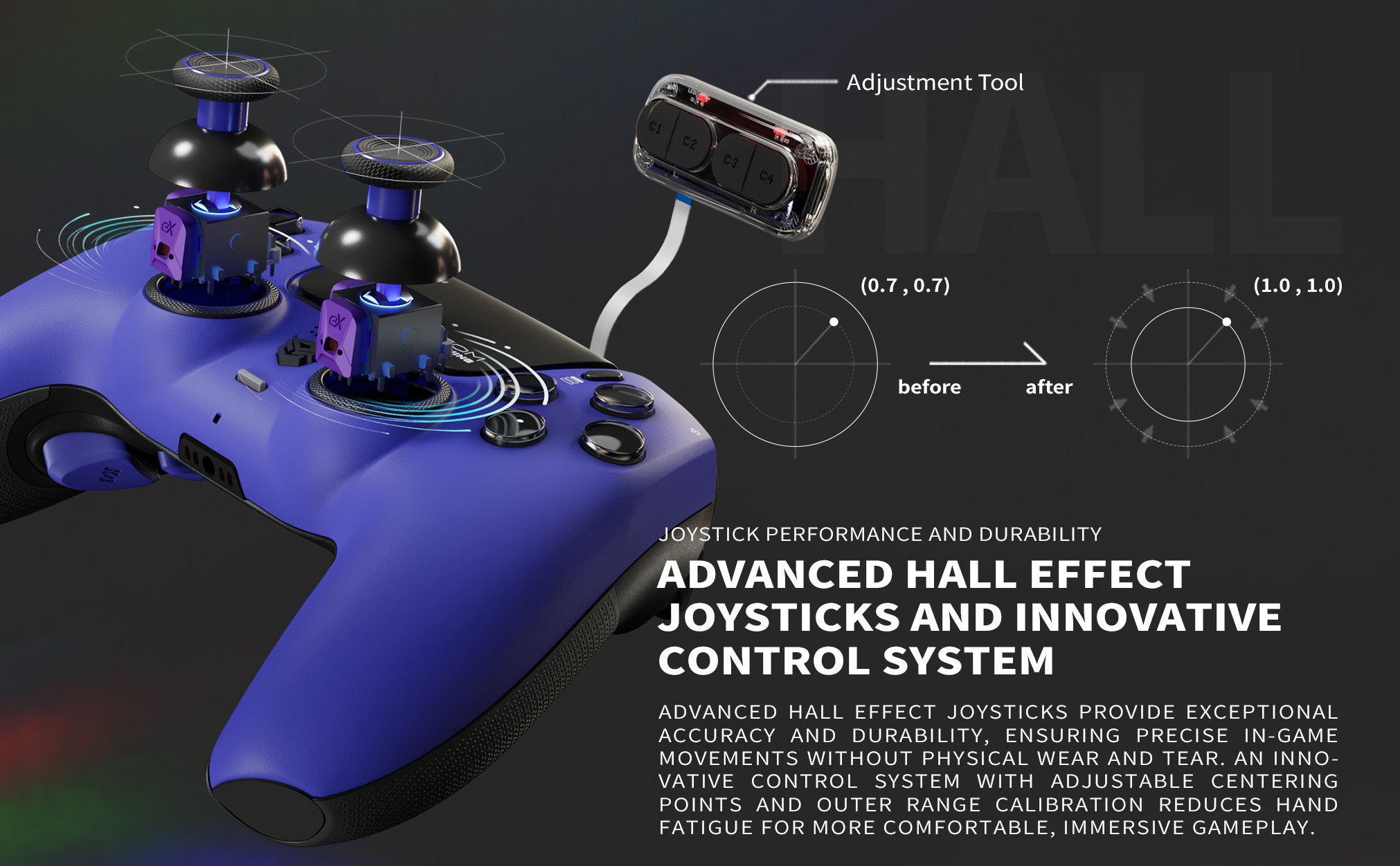 Unparalleled Joystick Performance and Durability — Advanced Hall effect joysticks deliver exceptional accuracy, long-lasting durability, and enhanced reliability, allowing for precise in-game movements and improved control with no physical wear and tear. Adjustable centering points and outer range calibration, courtesy of an innovative control system, reduce hand fatigue during extended gaming sessions for more comfortable and immersive gameplay.