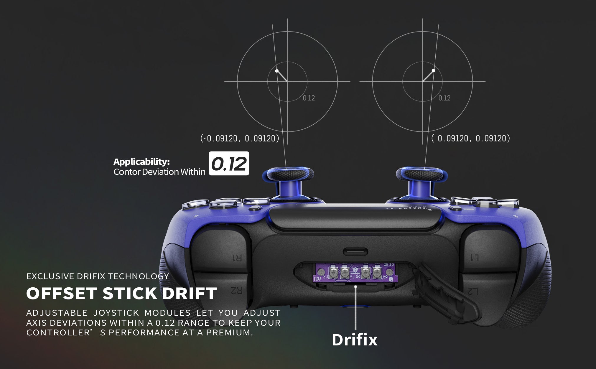 Offset Stick Drift — Keep your thumbsticks at pinpoint accuracy with our exclusive Drifix technology. Adjustable joystick modules let you adjust axis deviations within a 0.12 range to keep your controller’s performance at a premium.