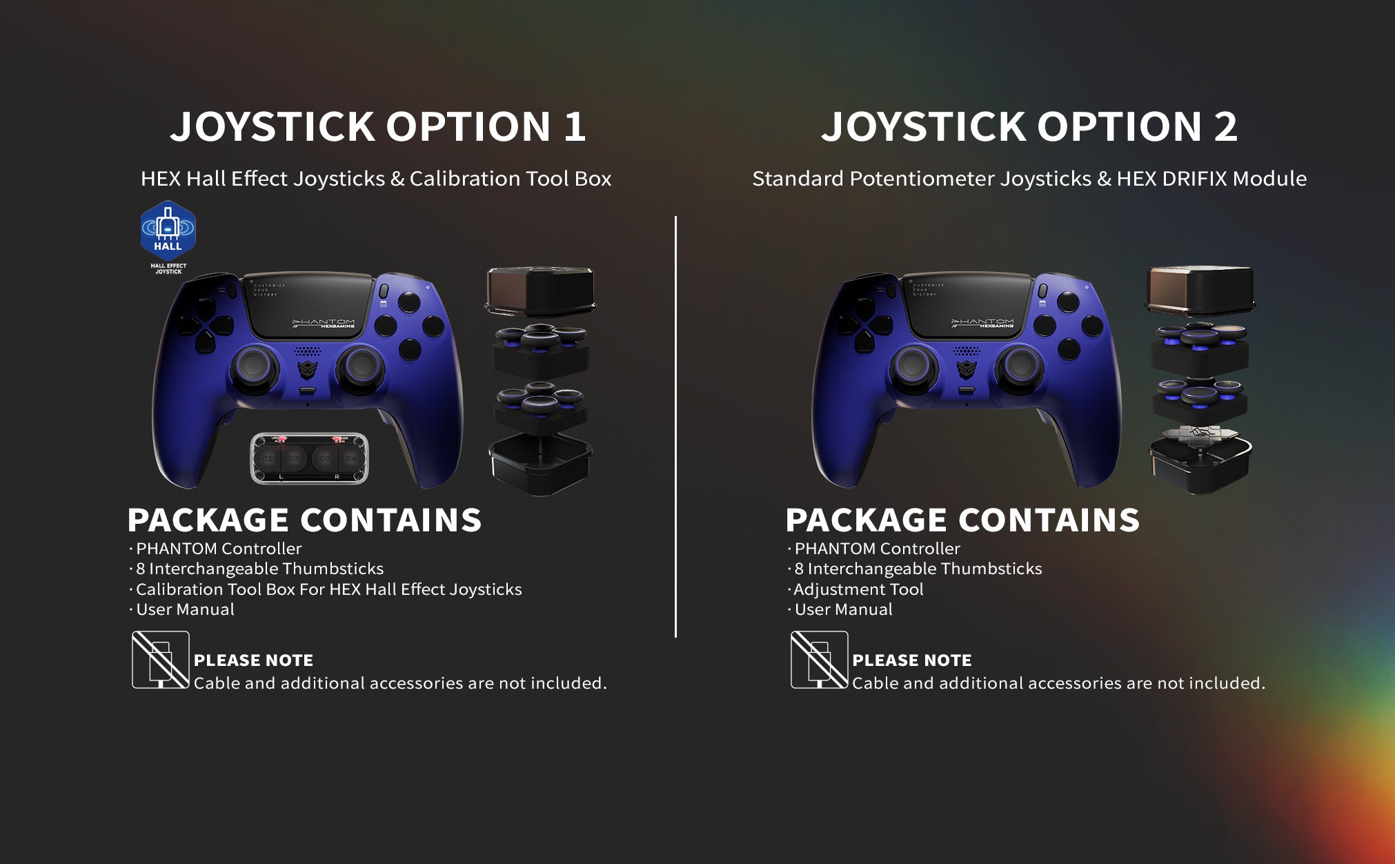 - Package Contents: PHANTOM eSports controller for PS5 and PC, 8 interchangeable thumbsticks, adjustment tool, and user manual. Please note: the wireless controller doesn't come with a cable or other accessories.