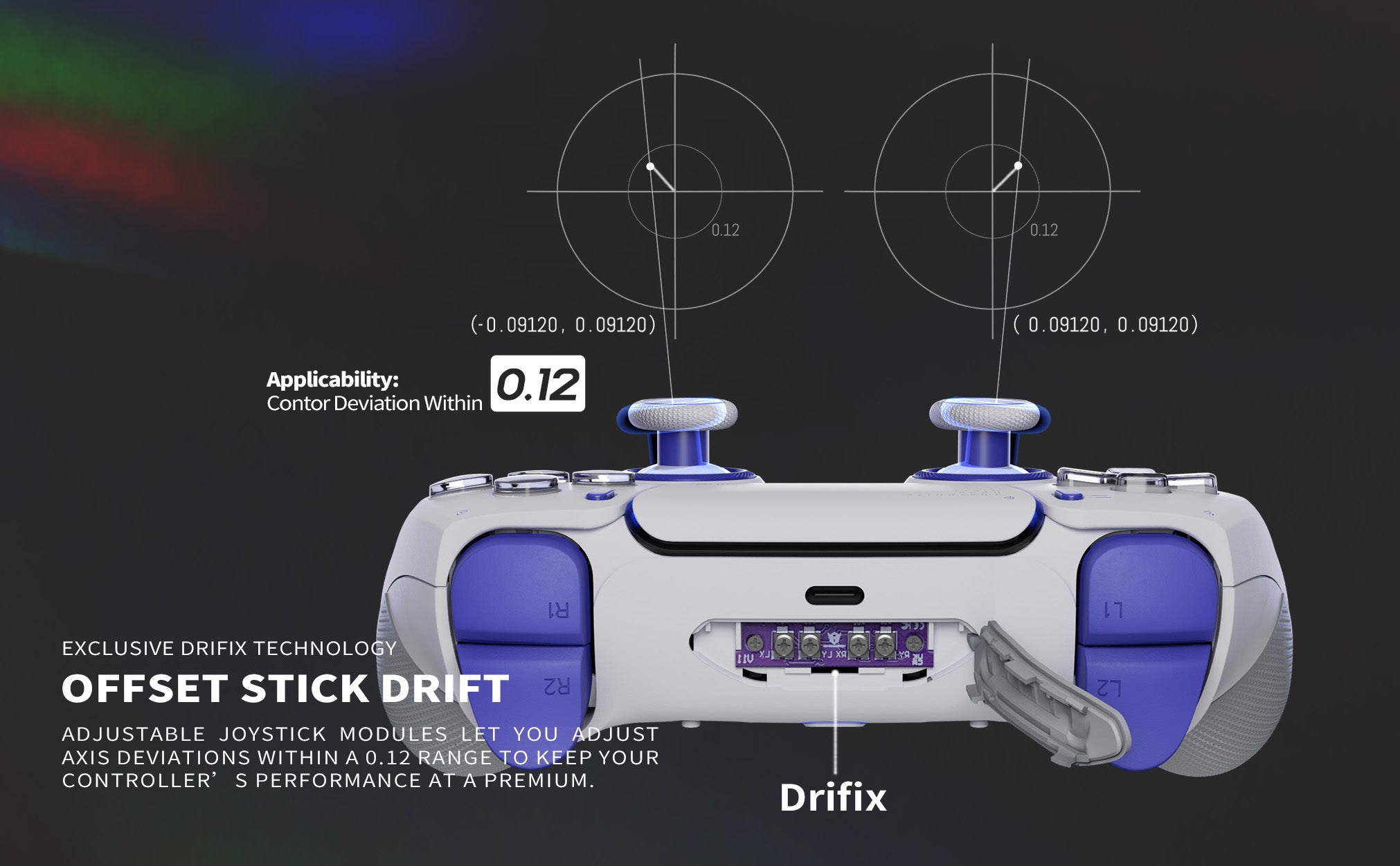 Offset Stick Drift — Keep your thumbsticks at pinpoint accuracy with our exclusive Drifix technology. Adjustable joystick modules let you adjust axis deviations within a 0.12 range to keep your controller’s performance at a premium.