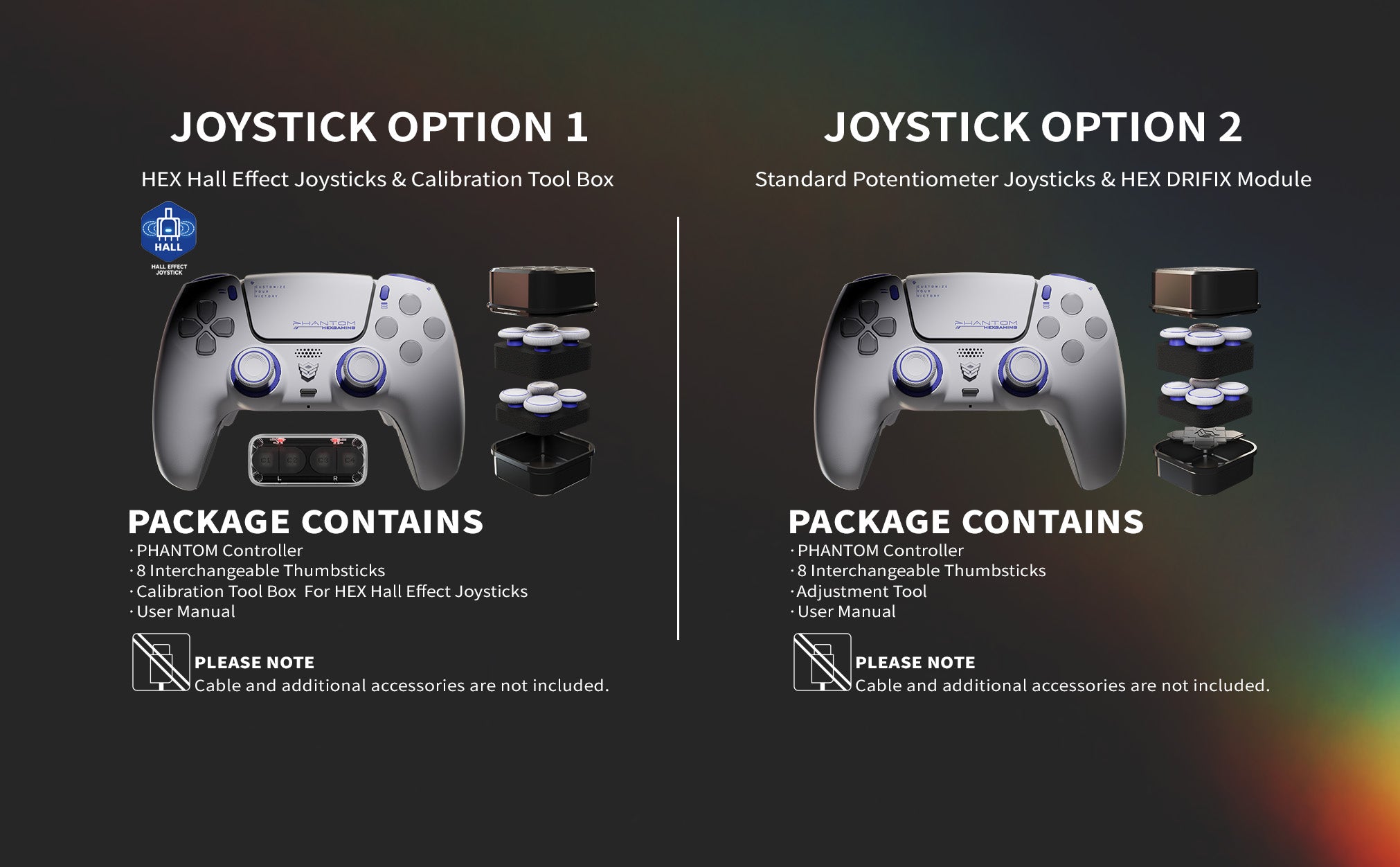 • Package Contents: PHANTOM eSports controller for PS5 and PC, 8 interchangeable thumbsticks, adjustment tool, and user manual. Please note: the wireless controller doesn't come with a cable or other accessories.