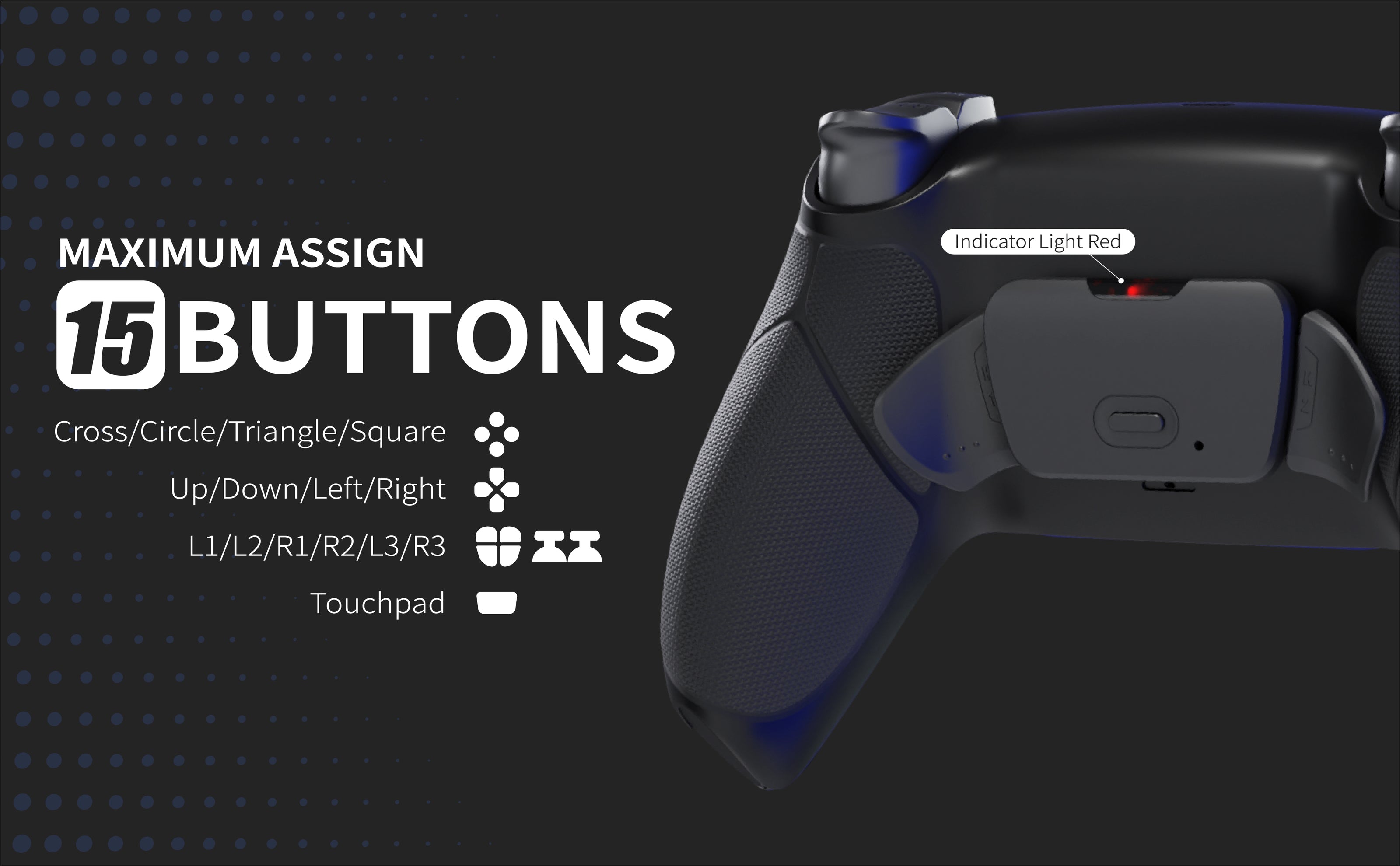 • You can activate the remap program during the game and assign maximum 15 buttons (X, O, Triangle, Square, Up, Down, Left, Right, L1, L2, R1, R2, L3, R3, Touchpad) to the rear buttons.