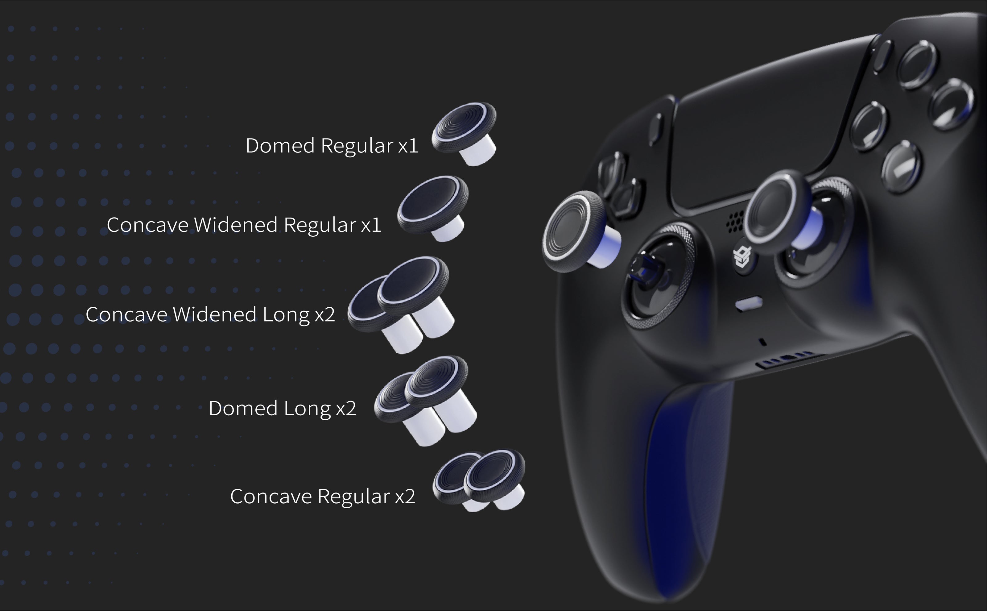 • Interchangeable textured thumbsticks, 2 different heights, 3 different ergonomic thumb grip designs, domed, concave, and concave widened. You can operate the controller flexibly, capture targets faster, and improve accuracy.