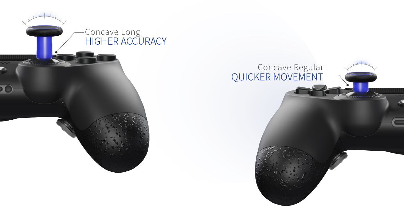 - Interchangeable textured thumbsticks, 2 different heights, 3 different ergonomic thumb grip designs, domed, concave, and concave widened. You can operate the controller flexibly, capture targets faster, and improve accuracy.