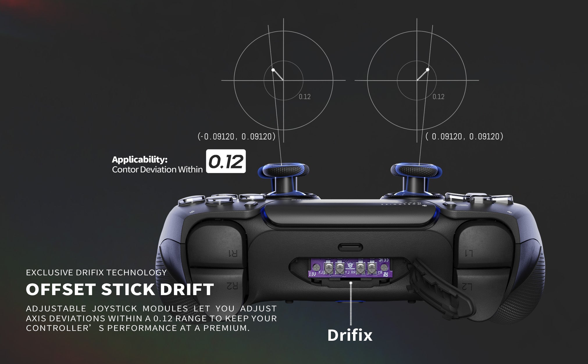 Offset Stick Drift — Keep your thumbsticks at pinpoint accuracy with our exclusive Drifix technology. Adjustable joystick modules let you adjust axis deviations within a 0.12 range to keep your controller’s performance at a premium.