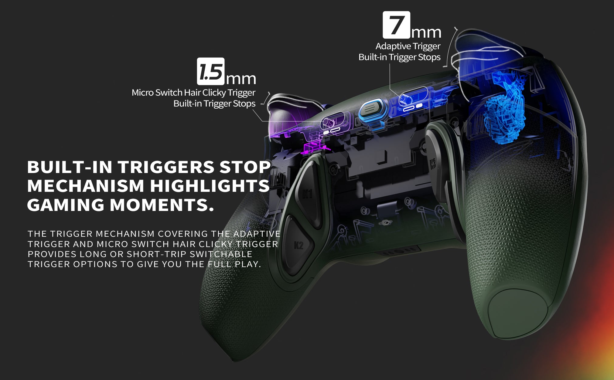 Perfect Your Trigger Pulls — Instantly toggle between adaptive and digital triggers with convenient trigger-mode switches. 1.5–2mm short-trip digital triggers, ideal for your favorite FPS games, give you mouse click trigger action. Meanwhile, adaptive triggers give you precise control, perfect for managing your throttle in racing games.
