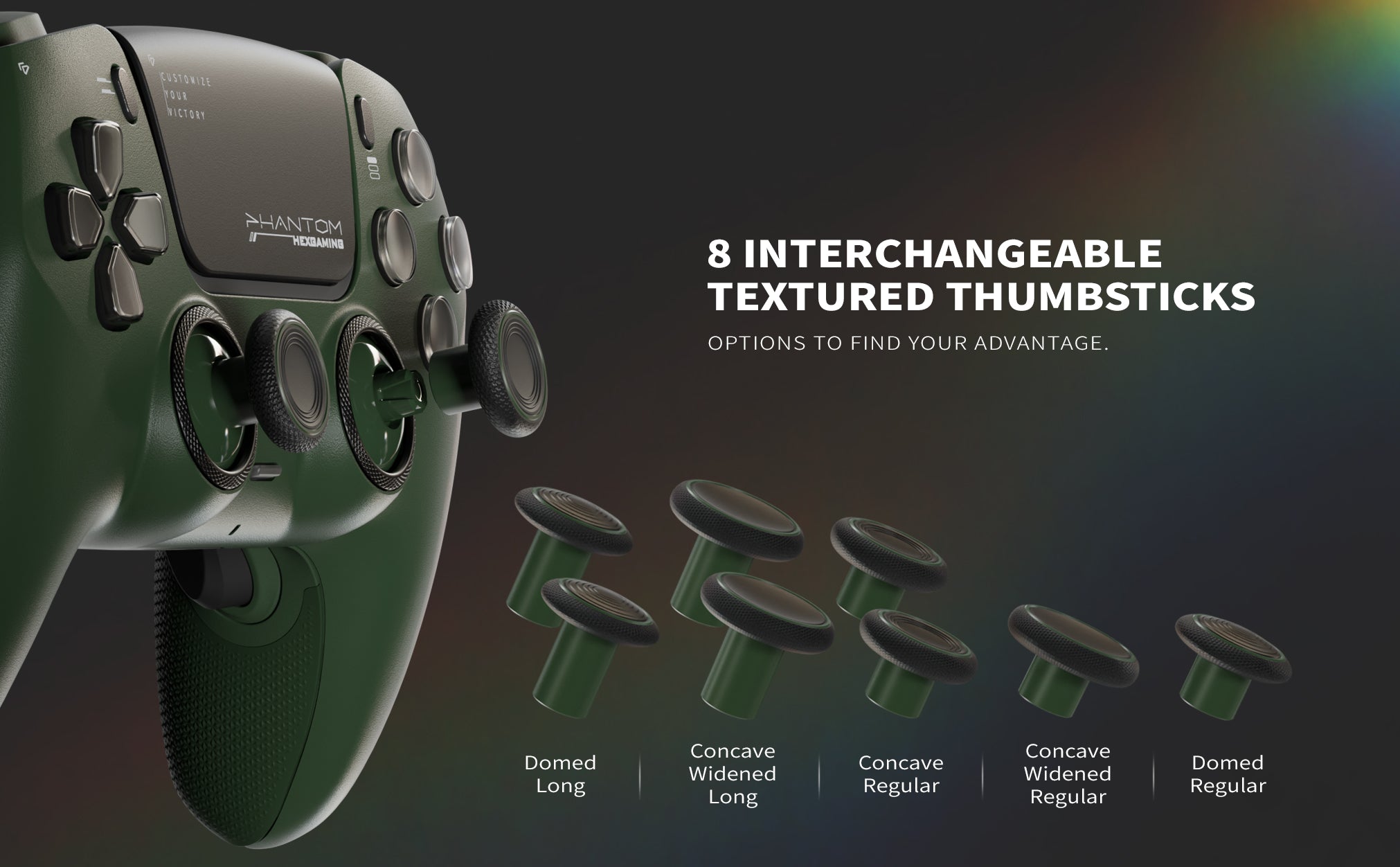 Get Ideal Stick Grip — Modify your thumbsticks to suit your playing habits. Swap between 8 interchangeable textured sticks to tweak your controller for maximum precision. Find your ideal fit with concave, domed, and extended joysticks for optimal comfort and performance.