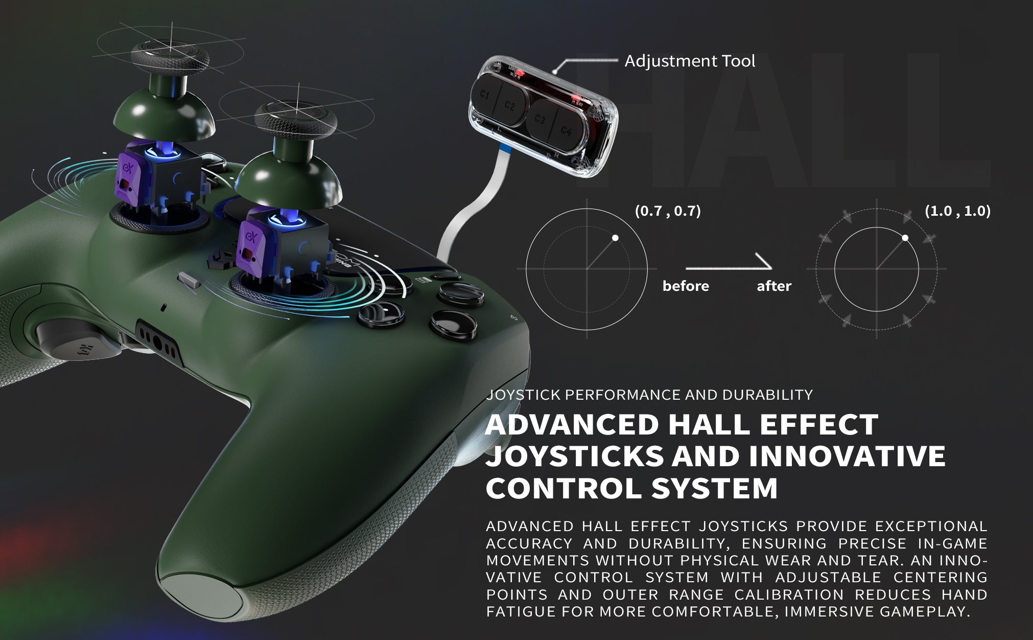 Unparalleled Joystick Performance and Durability — Advanced Hall effect joysticks deliver exceptional accuracy, long-lasting durability, and enhanced reliability, allowing for precise in-game movements and improved control with no physical wear and tear. Adjustable centering points and outer range calibration, courtesy of an innovative control system, reduce hand fatigue during extended gaming sessions for more comfortable and immersive gameplay.