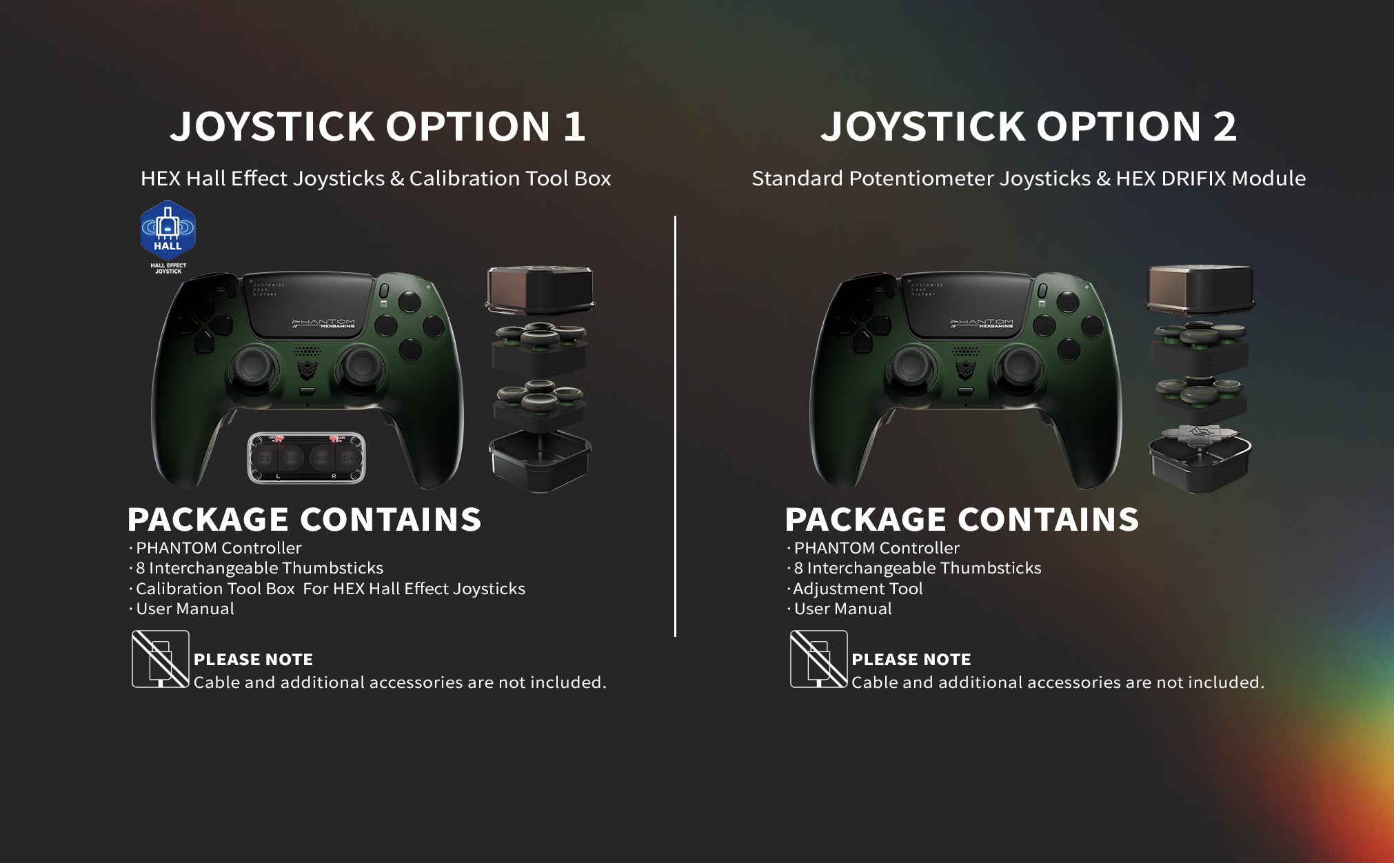 - Package Contents: PHANTOM eSports controller for PS5 and PC, 8 interchangeable thumbsticks, adjustment tool, and user manual. Please note: the wireless controller doesn't come with a cable or other accessories.