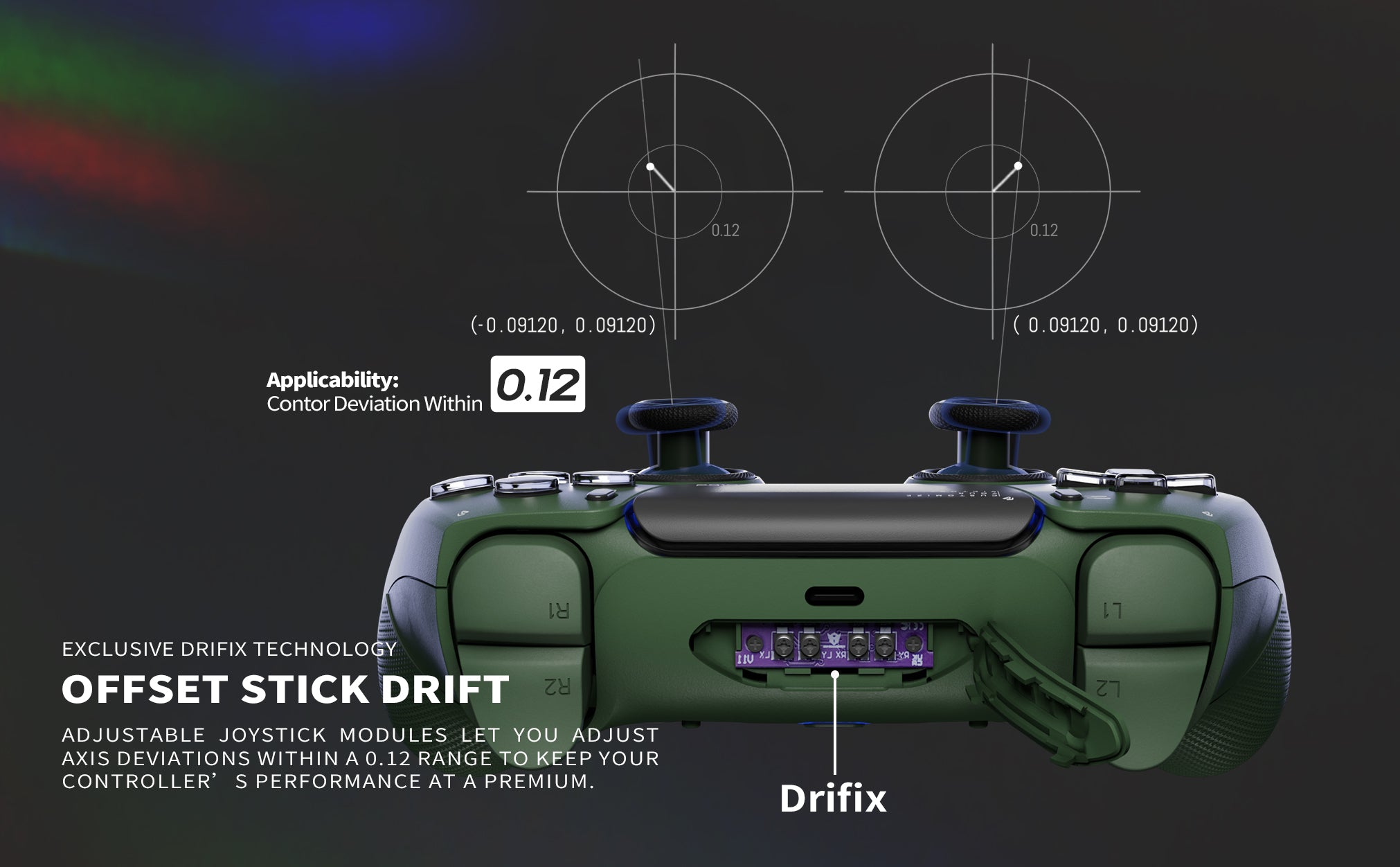 Offset Stick Drift — Keep your thumbsticks at pinpoint accuracy with our exclusive Drifix technology. Adjustable joystick modules let you adjust axis deviations within a 0.12 range to keep your controller’s performance at a premium.