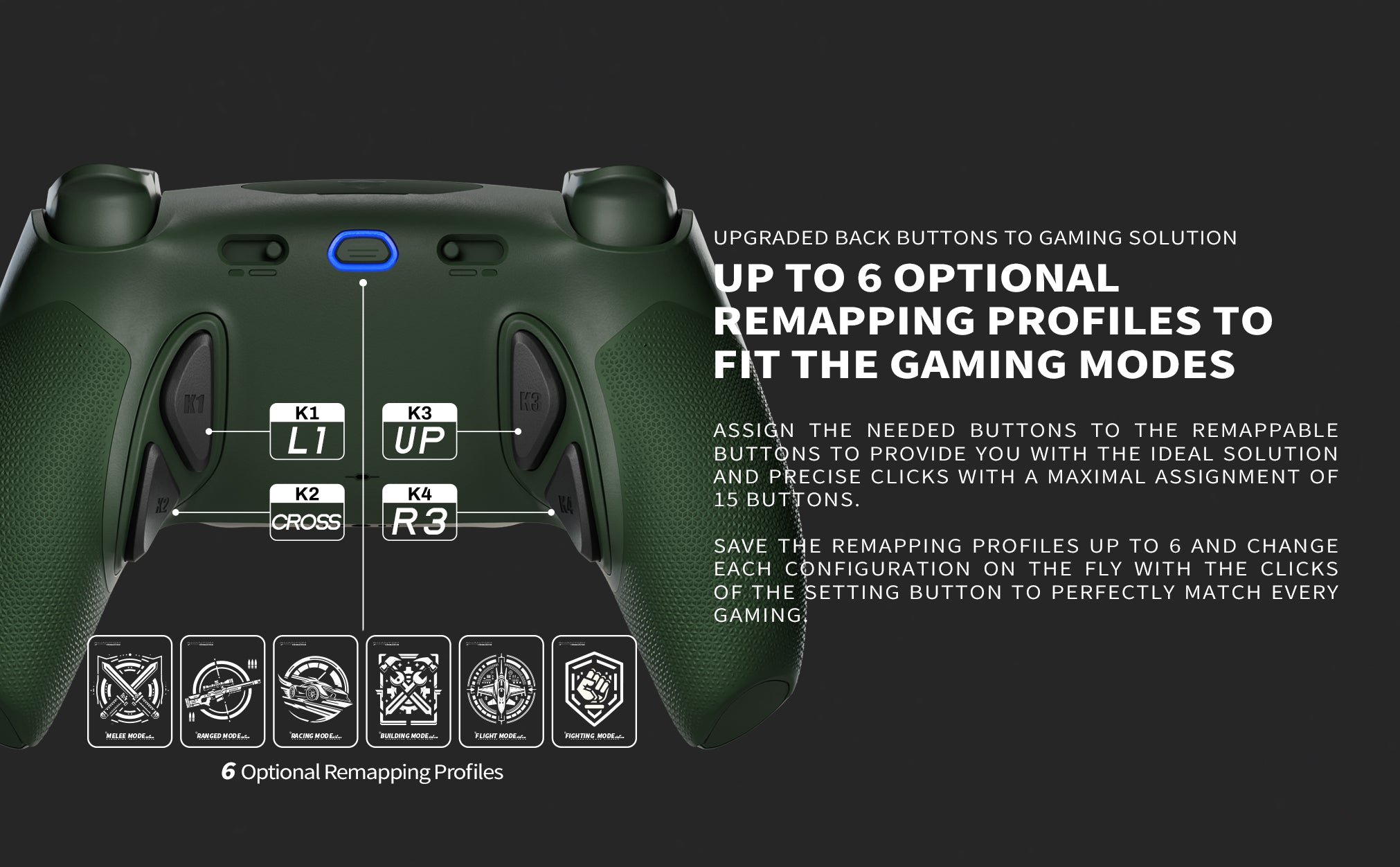 - Customize Your Layout: Fully remappable modded back buttons and 6 swappable profiles let you precisely tailor your controls and seamlessly switch between layouts. 4 tactile modded back buttons positioned at ergonomic points on the underside of your controller provide an excellent hands-on feeling and precise stop clicky button pressing while 6 swappable profiles let you swap between layouts on the fly to suit any game or playstyle.