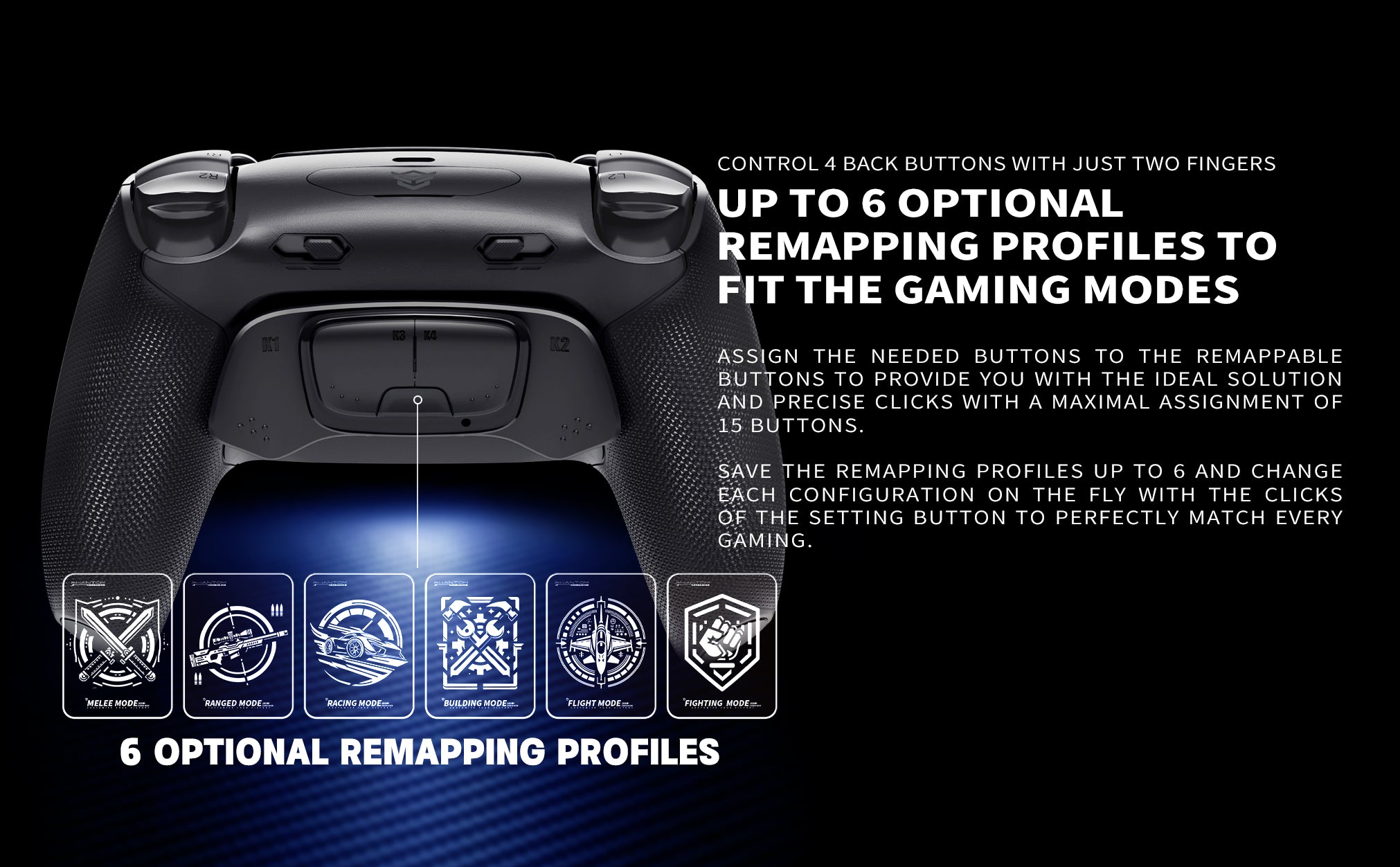 - Back Buttons Designed for Gamers: You can effortlessly control 4 back buttons with just two fingers. Each back button has raised anti-slip dots to prevent accidental presses. Plus, with 6 fully swappable profiles, you can quickly customize and switch layouts to suit any game or playstyle.