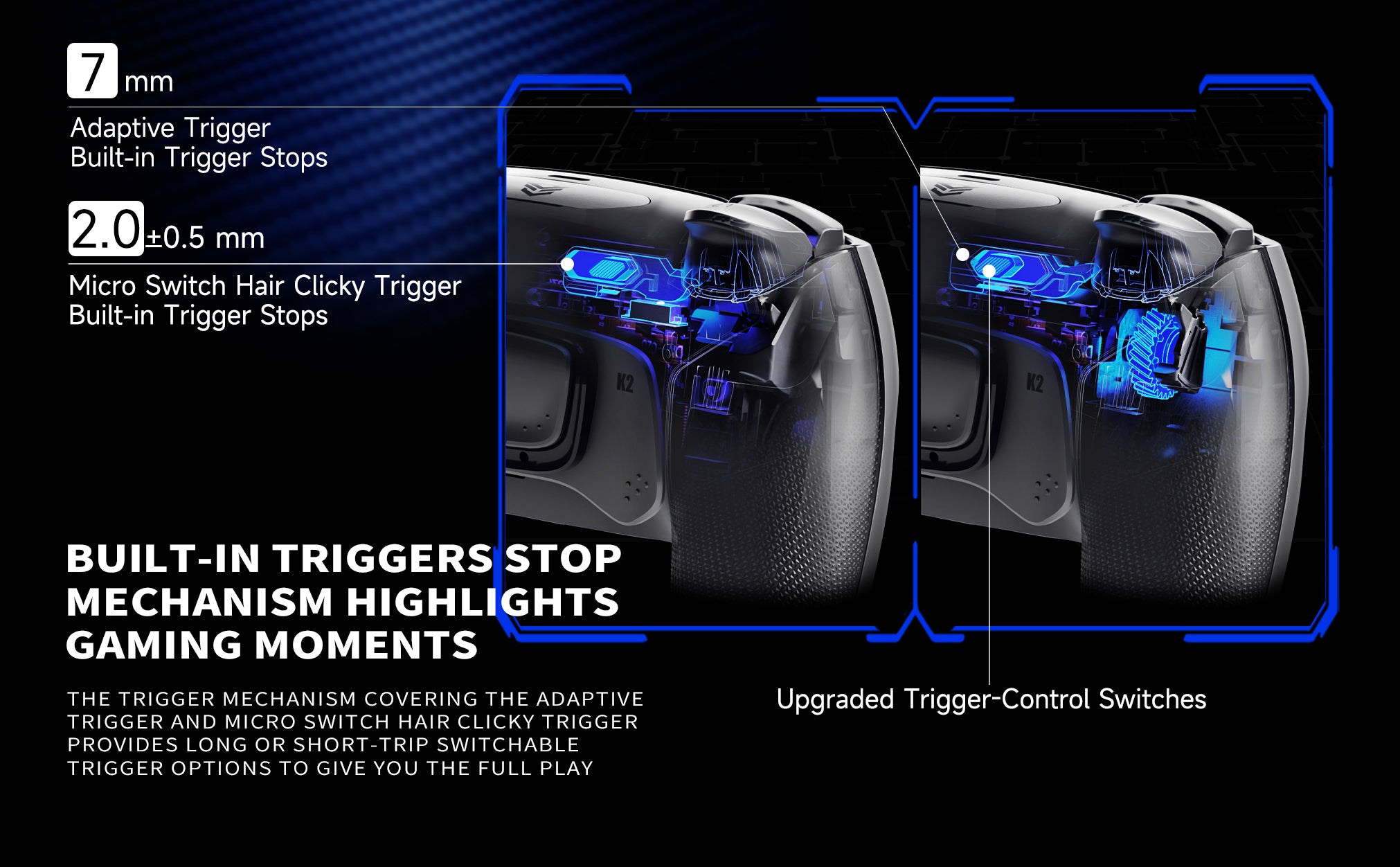 - Upgraded Trigger-Control Switches: Enlarged, textured switches allow you to quickly toggle between digital trigger and adaptive modes. Digital triggers with a short trip range of 1.5 to 2mm, ideal for your favorite FPS games, give you mouse click trigger action. Meanwhile, adaptive triggers give you precise control, perfect for managing your throttle in racing games.