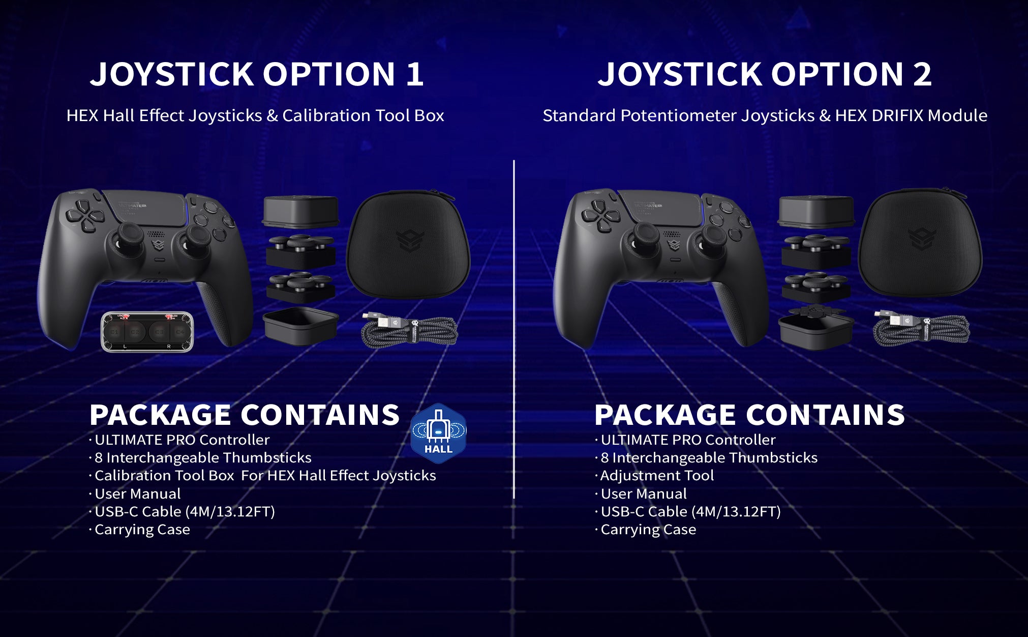 - Package Contents: ULTIMATE PRO eSports controller for ps5 and PC, 8 interchangeable thumbsticks, adjustment tool, user manual, USB-C cable (4M/13.12FT), and carrying case.