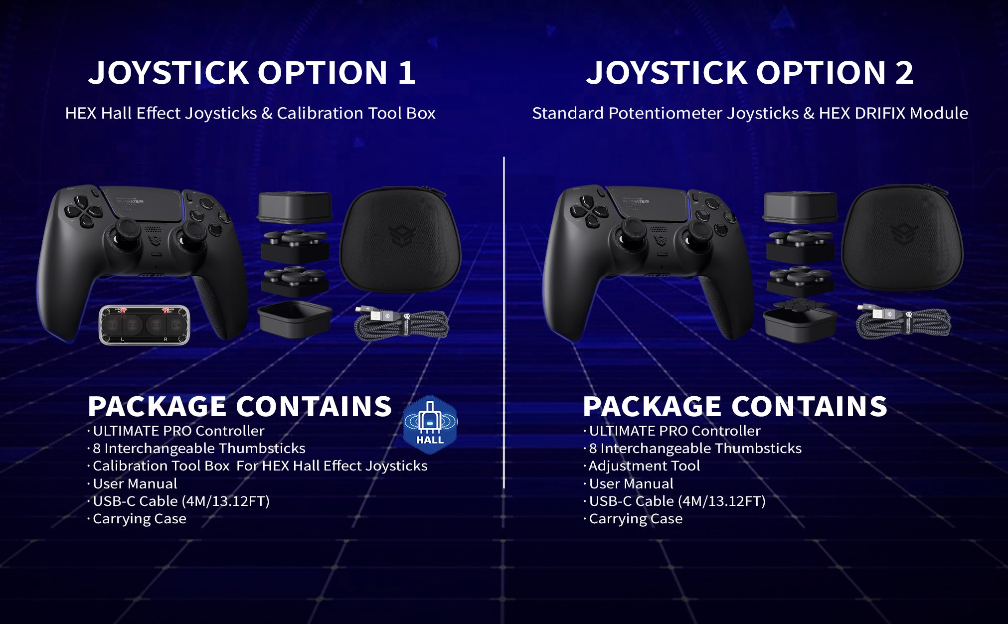 - Package Contents: ULTIMATE PRO eSports controller for ps5 and PC, 8 interchangeable thumbsticks, adjustment tool, user manual, USB-C cable (4M/13.12FT), and carrying case.