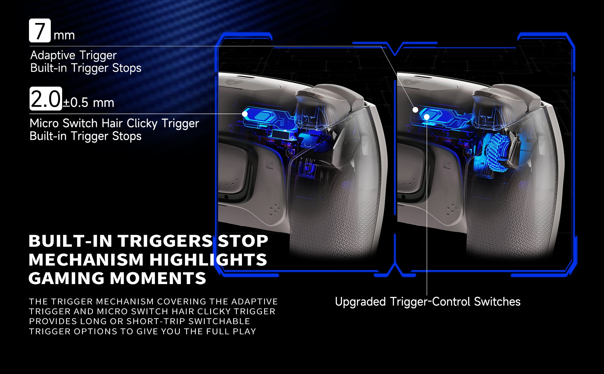 Adjustable Triggers - Enlarged, textured switches let you quickly toggle between fast digital triggers (1.5–2mm trip) for FPS games and adaptive triggers for racing games.