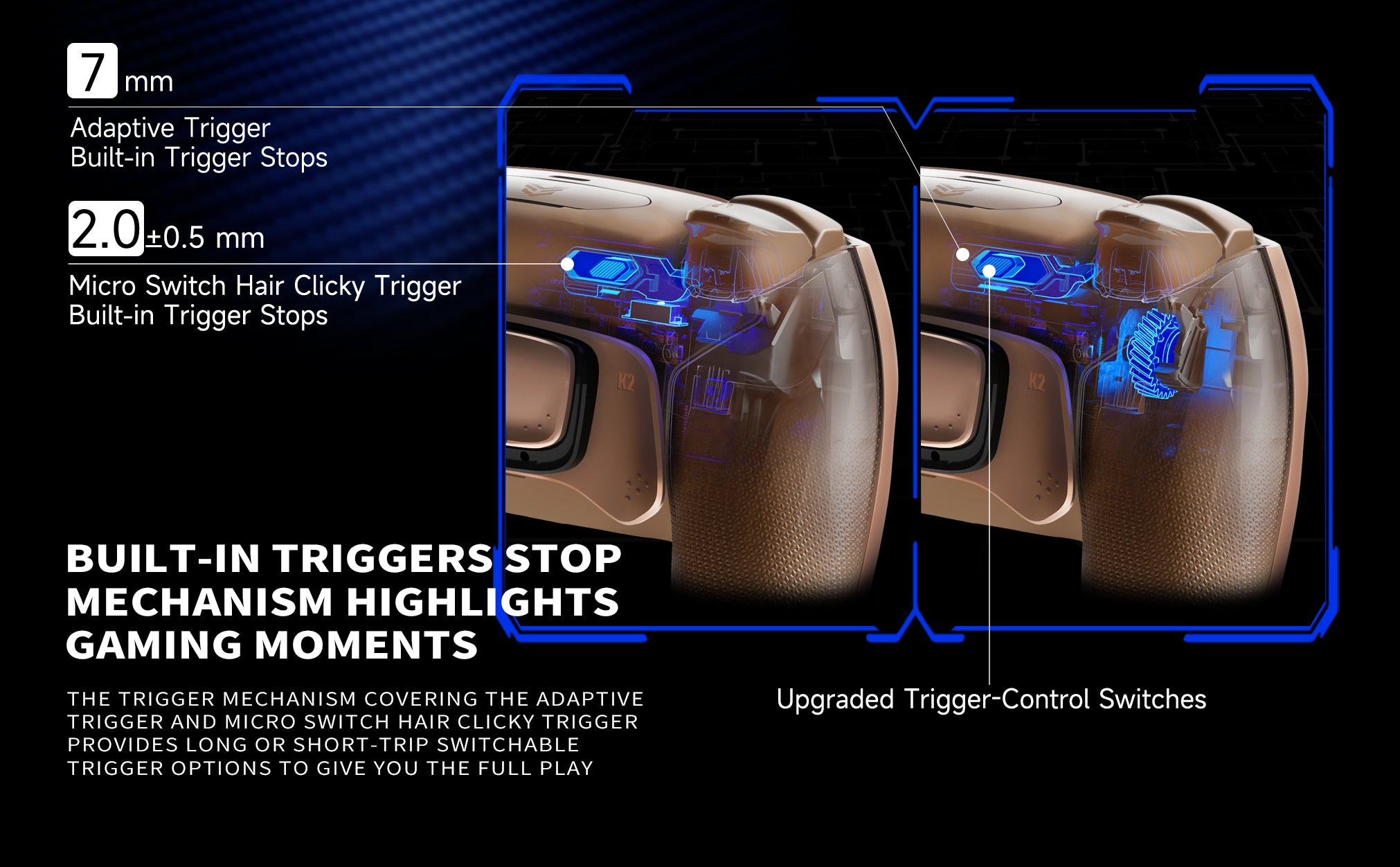 - Upgraded Trigger-Control Switches: Enlarged, textured switches allow you to quickly toggle between digital trigger and adaptive modes. Digital triggers with a short trip range of 1.5 to 2mm, ideal for your favorite FPS games, give you mouse click trigger action. Meanwhile, adaptive triggers give you precise control, perfect for managing your throttle in racing games.