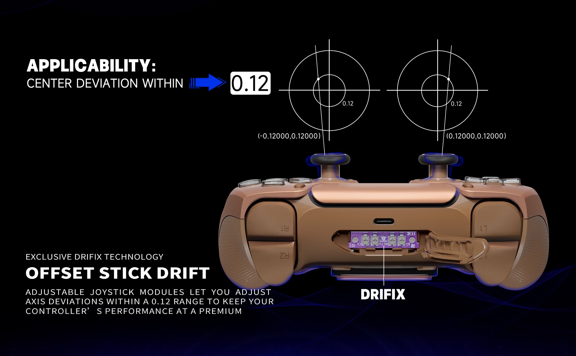 - Offset Stick Drift — Keep your thumbsticks at pinpoint accuracy with our exclusive Drifix technology. Adjustable joystick modules let you adjust axis deviations within a 0.12 range to keep your controller’s performance at a premium.