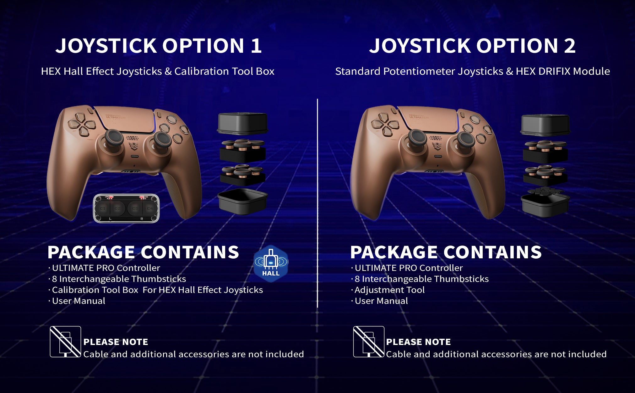 - Package Contents: ULTIMATE PRO eSports controller for ps5 and PC, 8 interchangeable thumbsticks, adjustment tool, and user manual. Please note: the wireless controller doesn't come with a cable or other accessories.