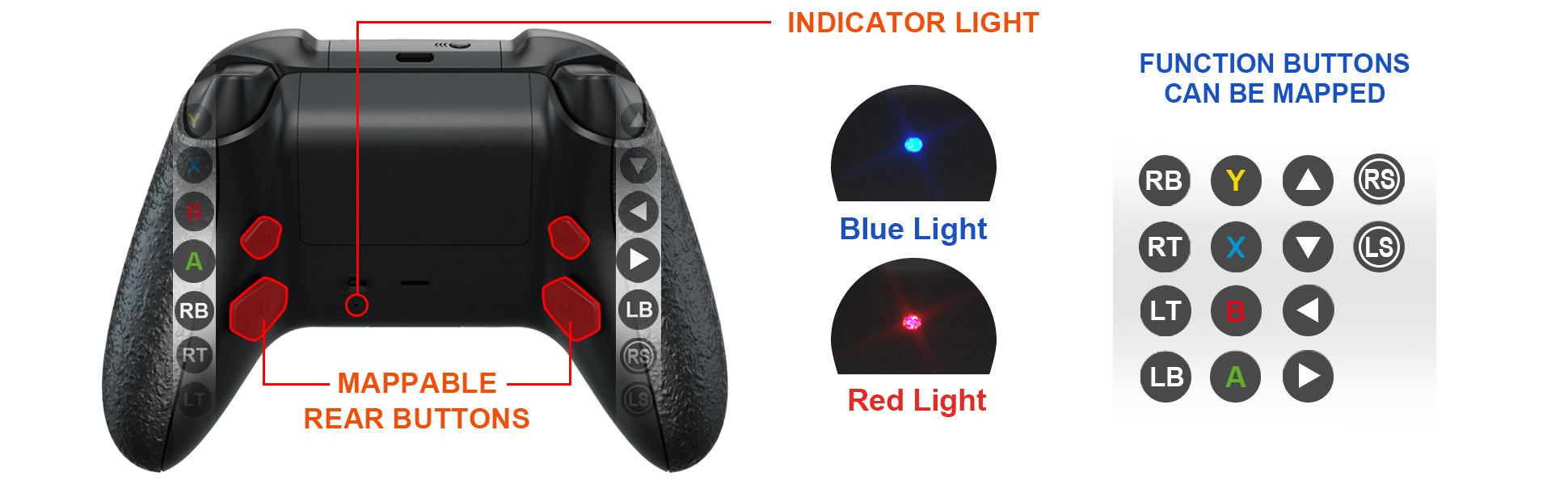 - You can activate the remap program during the game and assign maximum 14 buttons (available mapping options include: A, B, X, Y, R3, L3, UP, DOWN, LEFT, RIGHT, LB, RB, LT, RT) to the rear buttons.