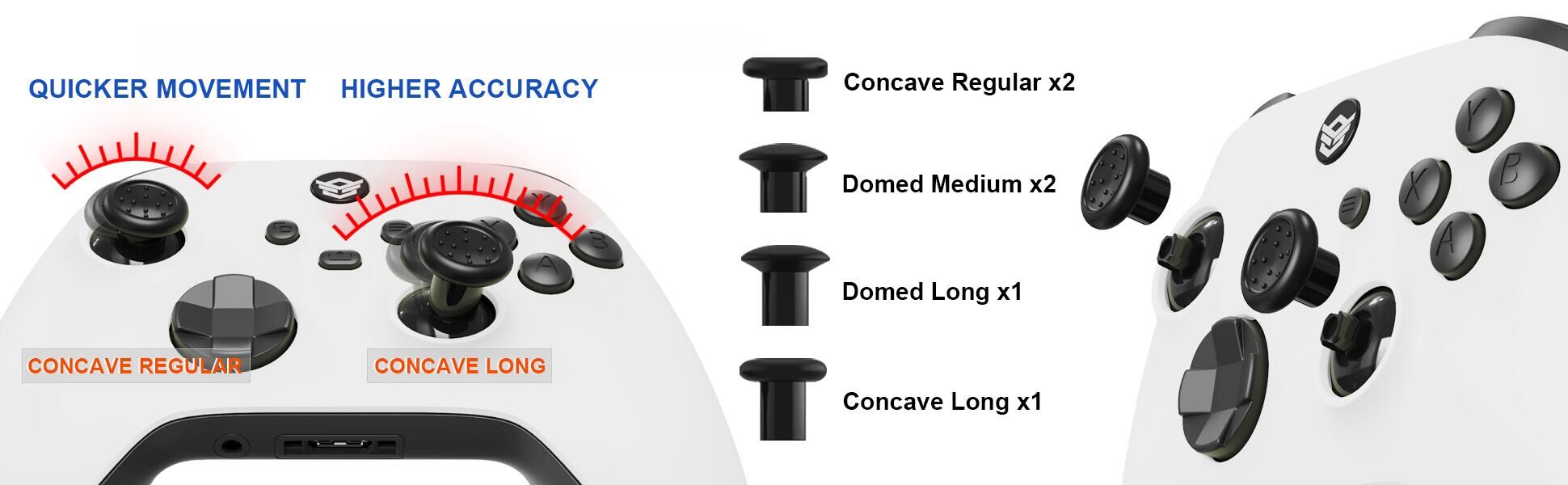 - 6 in 1 interchangeable thumbsticks, 3 different heights, 4 different ergonomic thumb grips, domed or concave. You can operate the controller flexibly, capture targets faster, and improve accuracy.