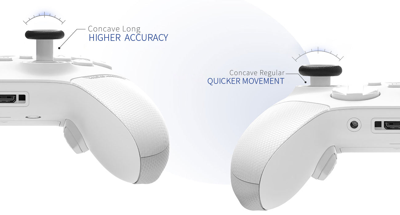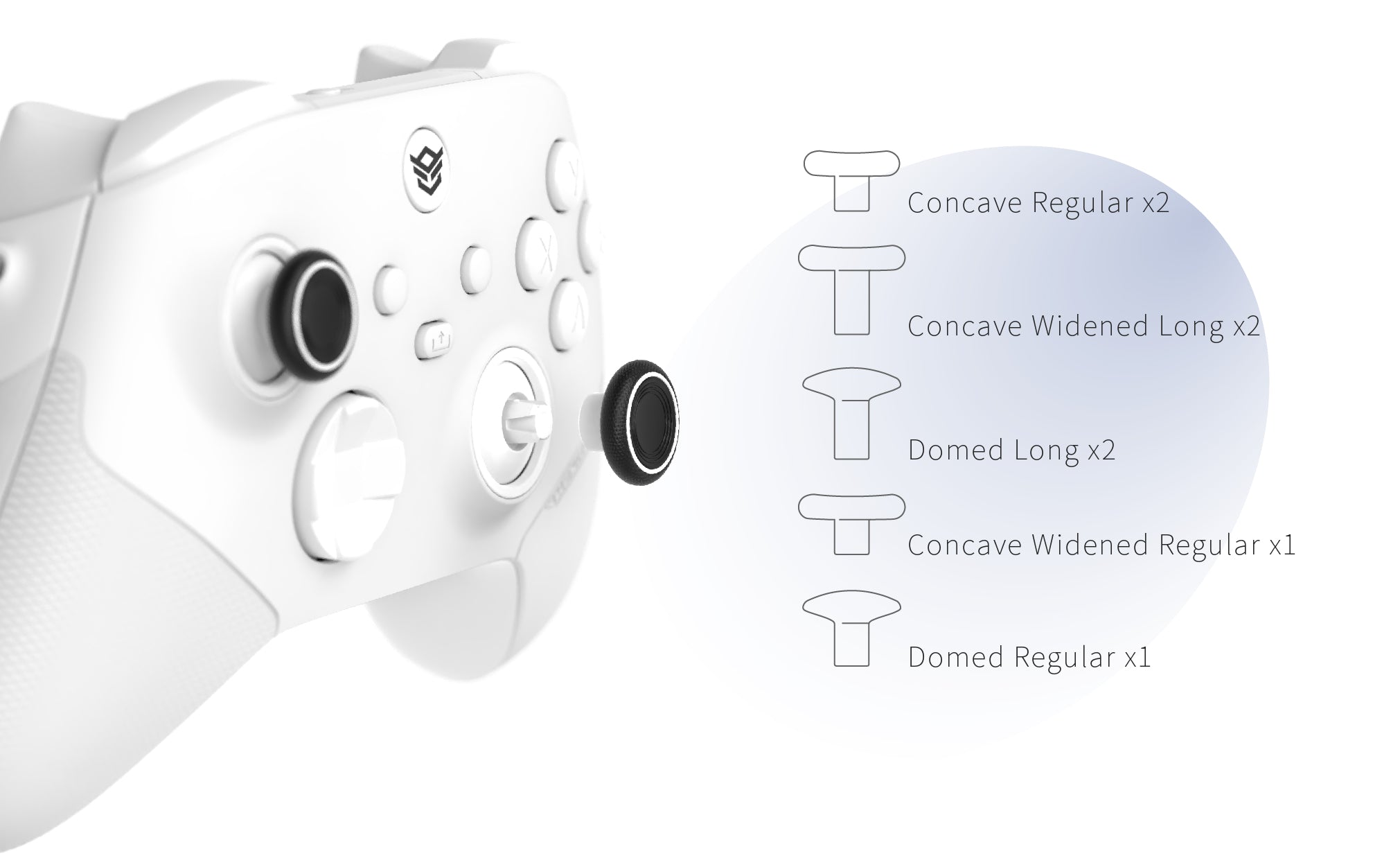- Interchangeable textured thumbsticks, 2 different heights, 3 different ergonomic thumb grip designs, domed, concave, and concave widened. You can operate the controller flexibly, capture targets faster, and improve accuracy.