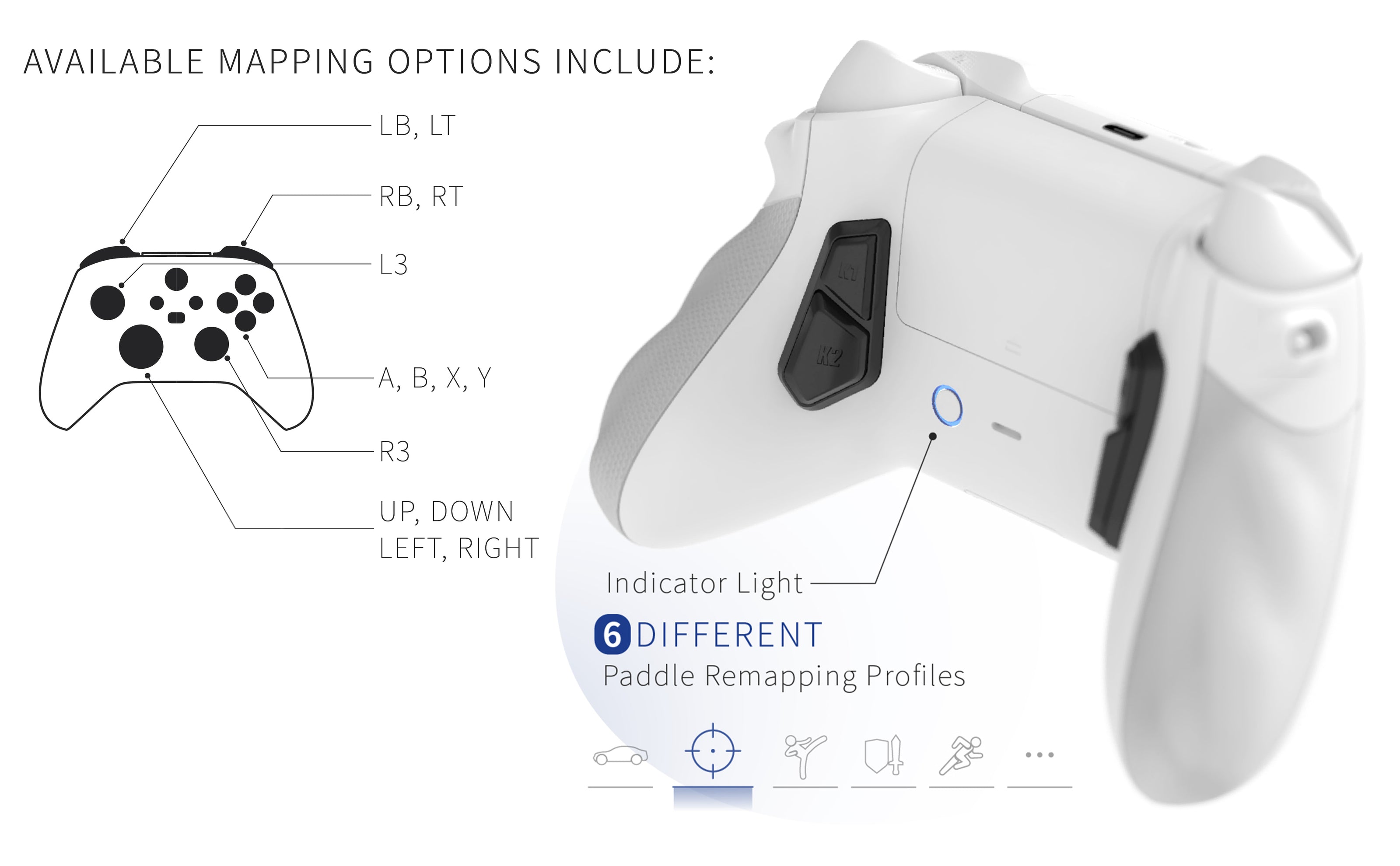 - Different games require different play styles. You can save up to six different paddle remapping profiles and switch between them on-the-fly with the press of a button, assigning a maximum of 14 buttons. (available mapping options include: A, B, X, Y, R3, L3, UP, DOWN, LEFT, RIGHT, LB, RB, LT, RT) to the rear buttons.